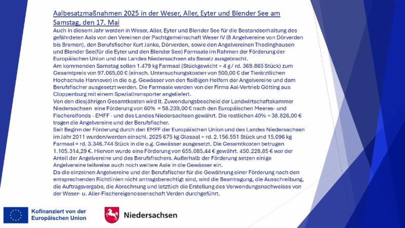 Die diesjährige Besatzaktion zur Bestandsstärkung des europäischen Aals mit einer erheblichen Förderung durch das Land Niedersachsen wird