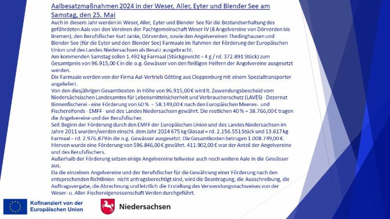 Zur Bestandsstärkung des europäischen Aals wurde wieder eine Besatzaktion mit einer erheblichen Förderung durch das Land Niedersachsen durchgeführt. Der Aalhof Götting aus Cloppenburg lieferte für die Vereine der Pachtgemeinschaft Weser IV insgesamt mehr als 1200 kg der mit allen notwendigen Herkunfts- und Gesundheitszertifikaten ausgestatteten Farmaale. Diese wurden unter Aufsicht des Pachtgemeinschafts-gewässerwartes Günter Leinweber an den verschiedenen Abladestellen im Bereich der Pachtgemeinschaft Weser IV an viele Helfer übergeben.